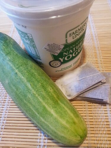 2) Teh hijau atau chamomile:  Basahkan uncang teh dan sejukkan semalaman. Letakkan diatas mata selama 15 minit sejurus selepas melakukan rawatan timun.