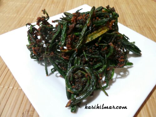 1) 1 mangkuk sayur paku bukit yang telah dikerat2. Batang yang besar dibelah dua.
