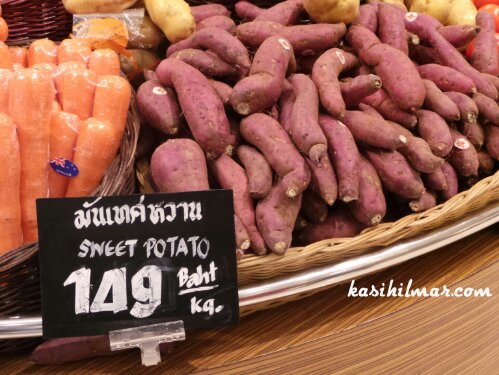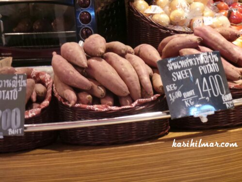Apa yang mengejutkan saya ketika di supermarket Siam Paragon ini ialah harga ubi keledek bakar. Satu kilo ubi keledek bakar adalah 1400 Baht lebih kurang RM 140. Mahal sungguh! Bagi sayalah, tak berbaloi nak makan ubi keledek bakar ini. Mungkin juga kualiti ubi ini berbeza sebab terdapat juga ubi keledek lain yang dijual sekilo dengan harga 149 Bhat, lebih kurang RM 14.90 sen sahaja.