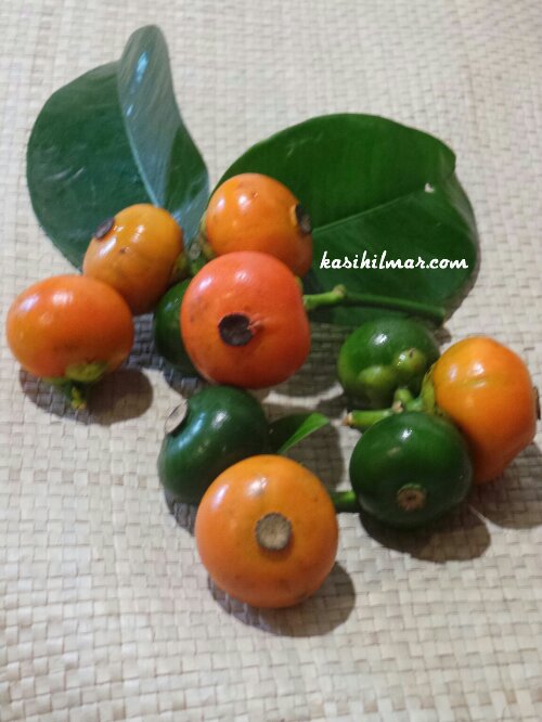 3) 3 biji buah cepu ranum dibelah buang biji. Kulit buah cepu tidak dibuang dan kemudian isi dan kulit dihiris nipis.