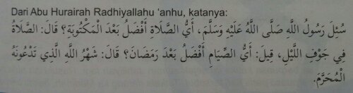 Ertinya: “Rasulullah s.a.w pernah ditanya: ‘Solat apakah yang lebih diutamakan setelah solat fardu?’ Beliau menjawab: ‘Mengerjakan solat sunat ditengah malam.’ Beliau ditanya lagi: ‘Puasa apakah yang lebih diutamakan setelah puasa Ramadan?’ Beliau menjawab: Berpuasa di bulan Allah yang kamu namakan sebagai bulan al Muharram.”