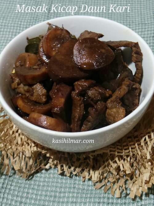 3) Masukkan cili api, daun kari, daging dan kicap dan masak sehingga hampir kering