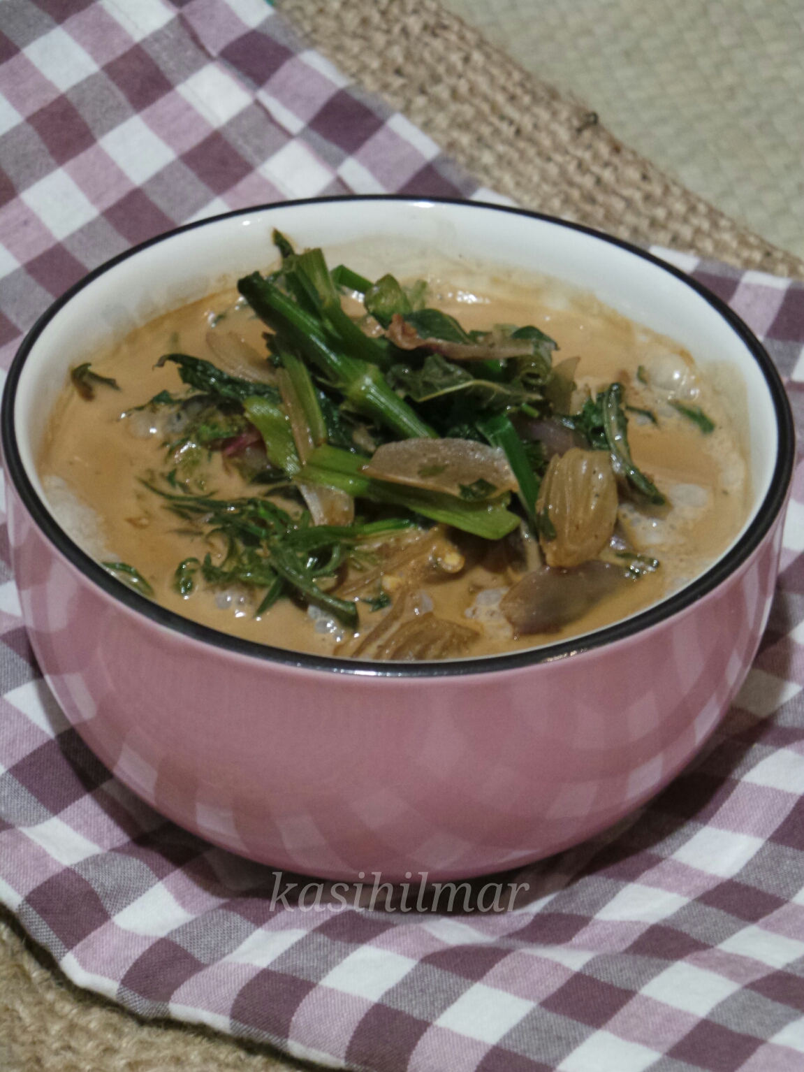 2) Bila ulam raja lembut, masukkan cili padi, bawang merah, daun kesum, santan dan kicap.