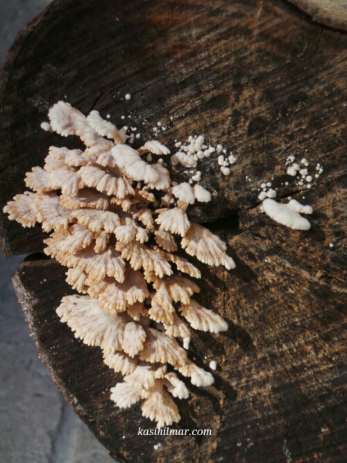Terkejut juga saya, bila melihat cendawan/ kulat sisir tumbuh dengan banyaknya di atas batang getah itu. Mungkin juga sebab akhir-akhir ini sering hujan maka cendawan pun mula tumbuh bila batang kayu getah dalam proses pereputan.