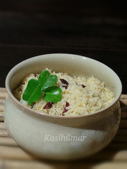4) Masukkan daun limau purut. Kacau nasi dan masak atas api lama sedikit.