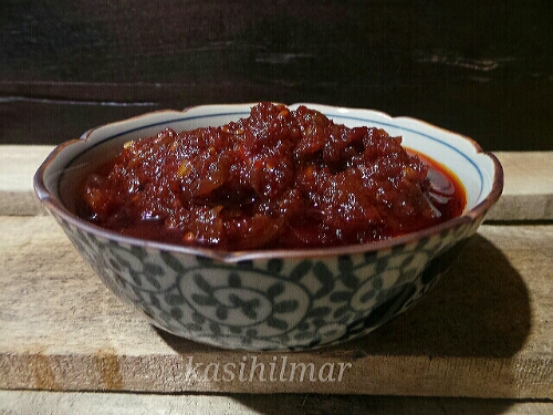 4) Bila sambal tumis dah suam, bolehlah senduk buang lebihan minyak.