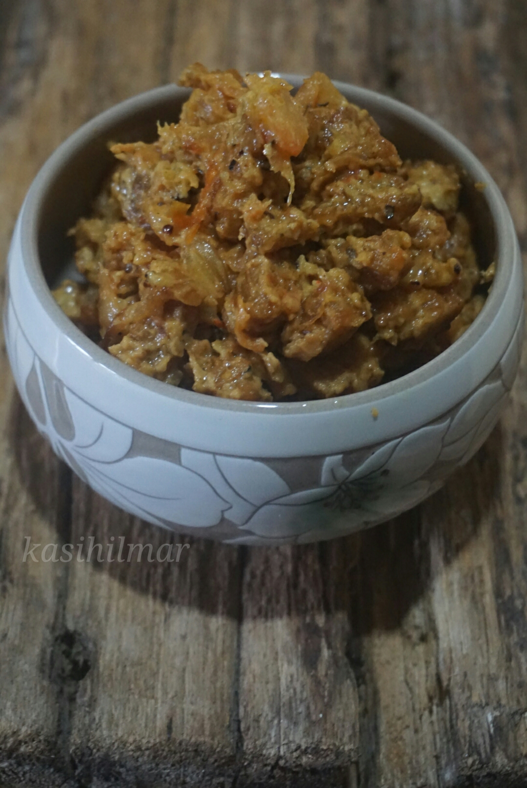 2) Panaskan minyak secukupnya, masukkan bawang besar, bawang putih dan cili padi dan goreng sehingga bawang sedikit garing. Angkat dan toskan