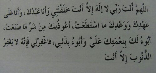 Maksudnya: “Ya Allah, Engkau adalah Rabbku, tidak ada Tuhan melainkan Engkau, Engkau-lah yang menciptakan aku. Aku adalah hamba-Mu, dan aku berjanji mentaati-Mu semampuku, aku berlindung kepada-Mu daripada kejahatan kelakuanku. Aku mengakui nikmat-Mu kepadaku dan aku mengakui dosaku. Ampunilah aku. Sesungguhnya tiada yang mengampuni dosa melainkan Engkau.”