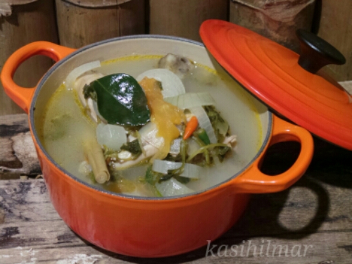6) Masukkan ayam yang telah masak dibakar ke dalam kuah dan gaul rata dan masak di atas api sekejap.