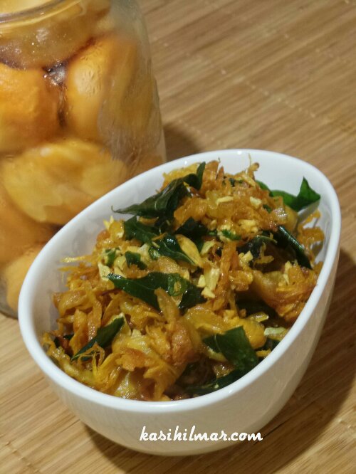 1) Gaul kulit cempedak, jintan manis dan garam secukup rasa sehingga rata dan biarkan selama 30 minit.