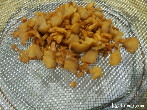 2) Goreng ikan masin dan bawang putih sehingga kekuningan dan kemudian tos kan.
