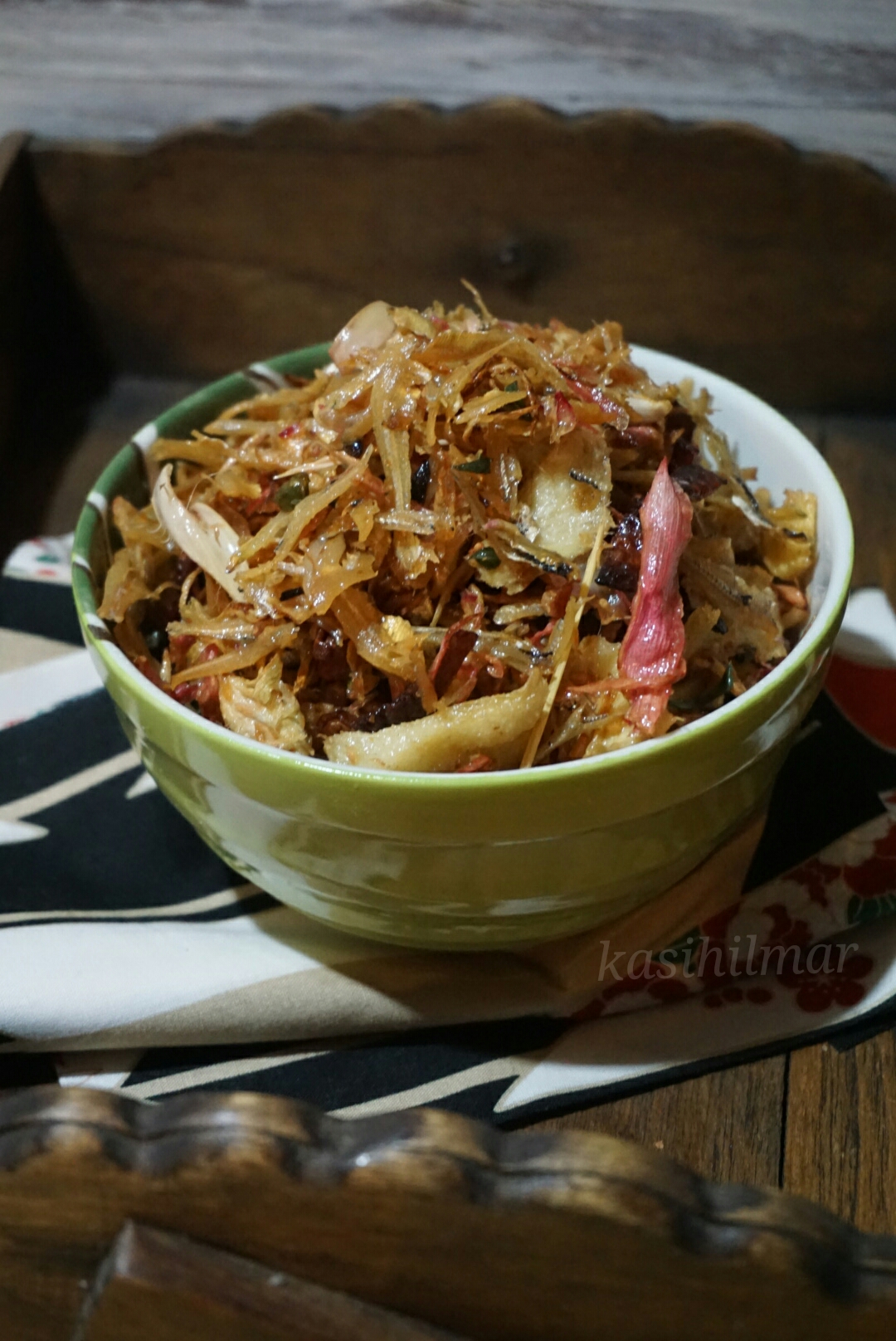 1) Panaskan minyak dan goreng semua bahan yang telah disatukan sehingga bawang kelihatan garing. Tuangkan ke dalam penapis dan toskan