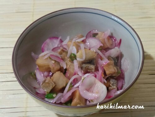Saya suka buat masakan ini di waktu tengah hari dan kemudian biarkan dalam peti sejuk beberapa jam supaya jus lemon dan air bawang dan cili serap ke dalam ikan masin. Sejam sebelum dihidangkan, baru saya keluarkan.