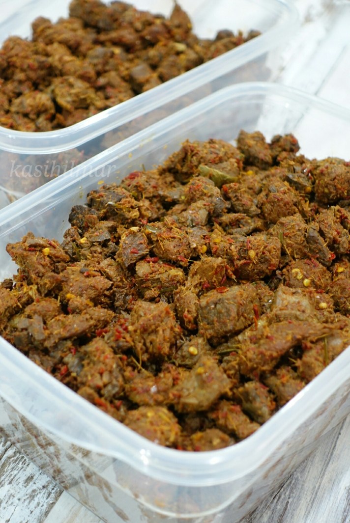 5. Bila rendang hampir kering, masukkan kerisik, daun limau purut, gula dan garam.