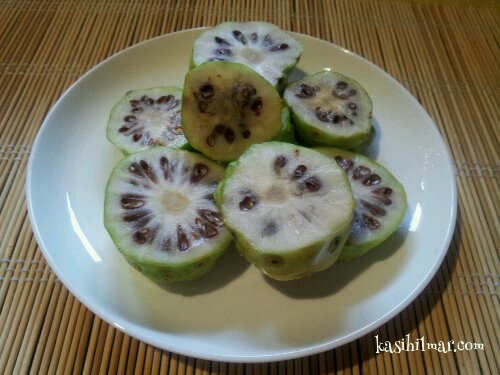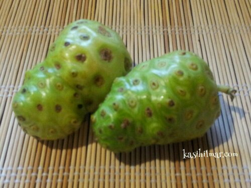 2) 2 biji buah mengkudu yang muda. Dihiris tanpa buang kulit.